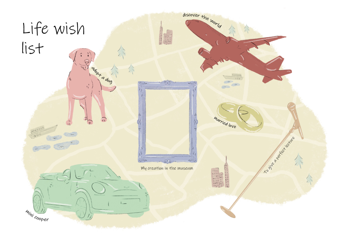 כחלק ממשימה בלימודים יצרתי איור בProcreate, בשפה עיצובית של קו וכתם ובצבעוניות רכה. האיור מציג מפת חלומות אישית הממחישה שאיפות וחזונות לעתיד